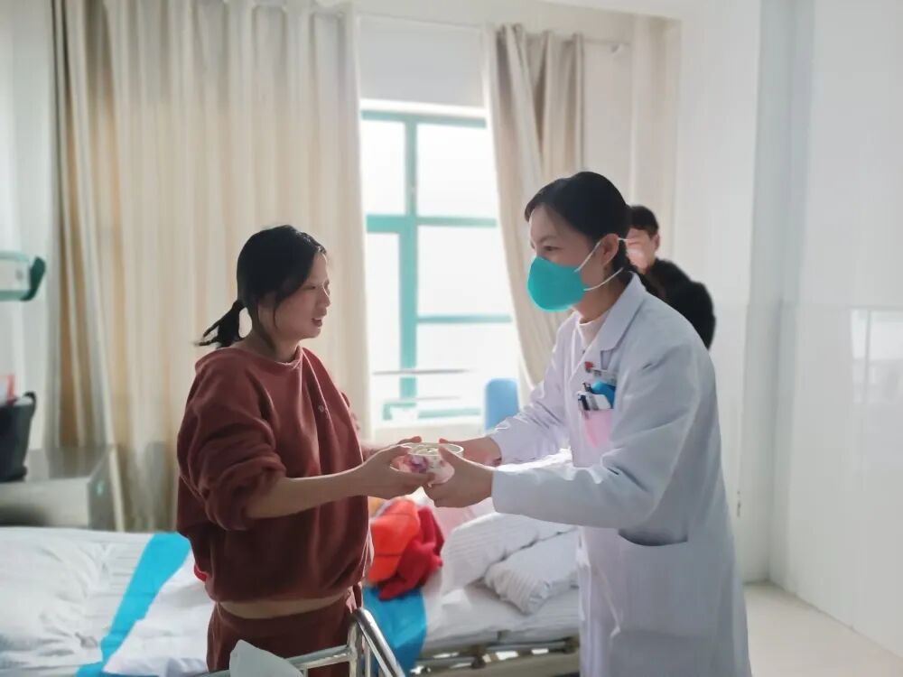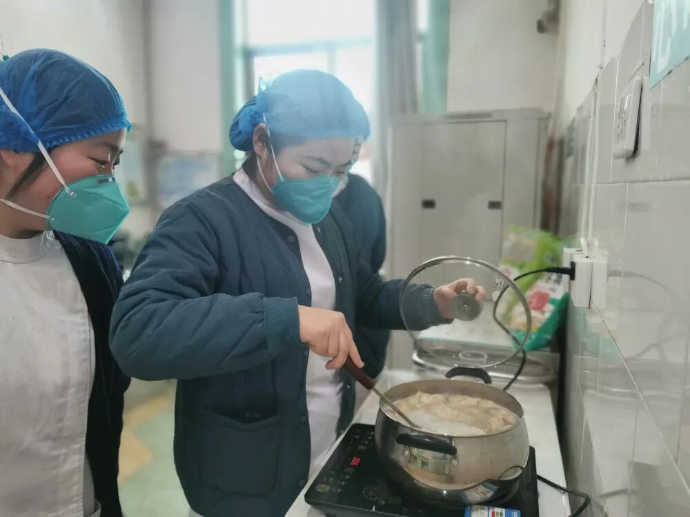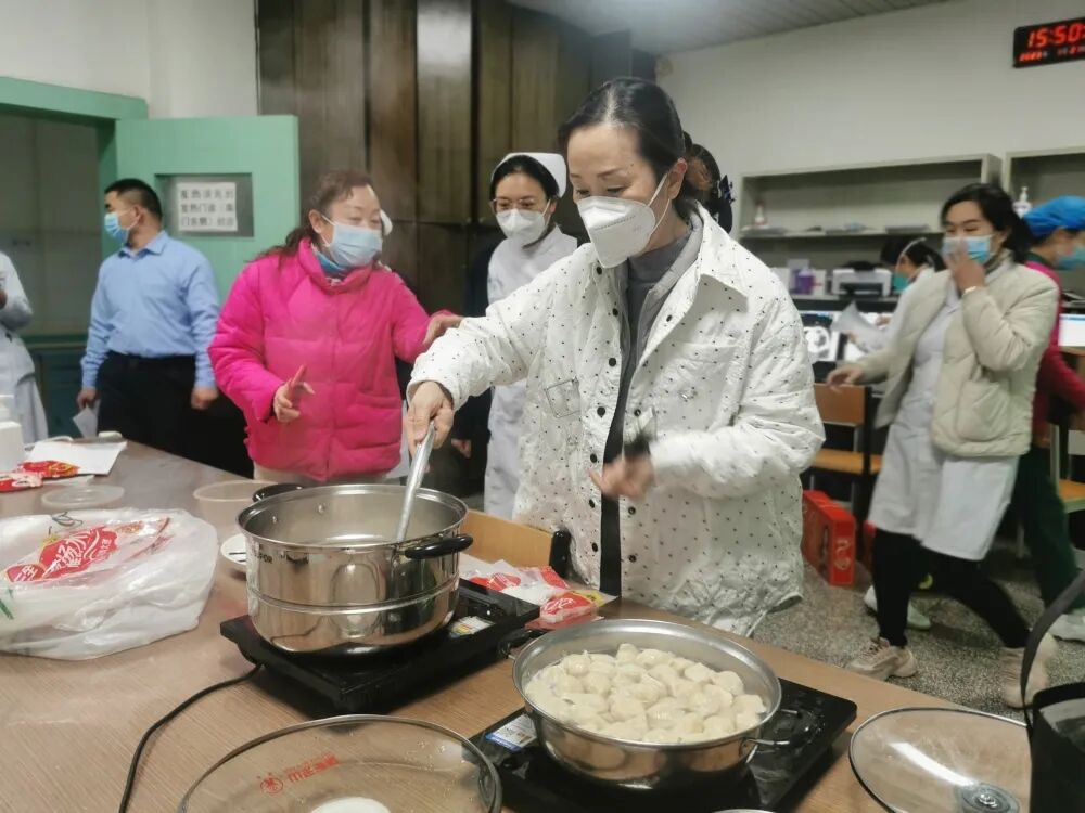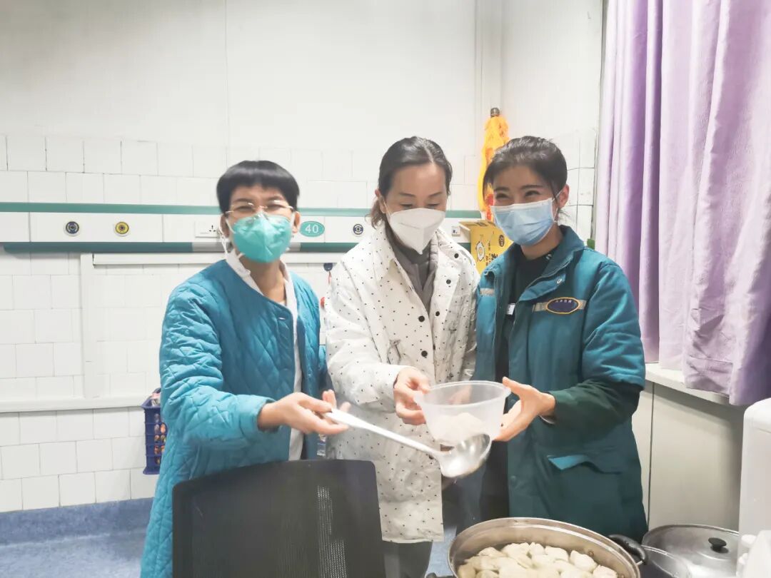 院領(lǐng)導(dǎo)們和工作人員把熱氣騰騰、香噴噴的餃子送到在院患者及家屬的床前。