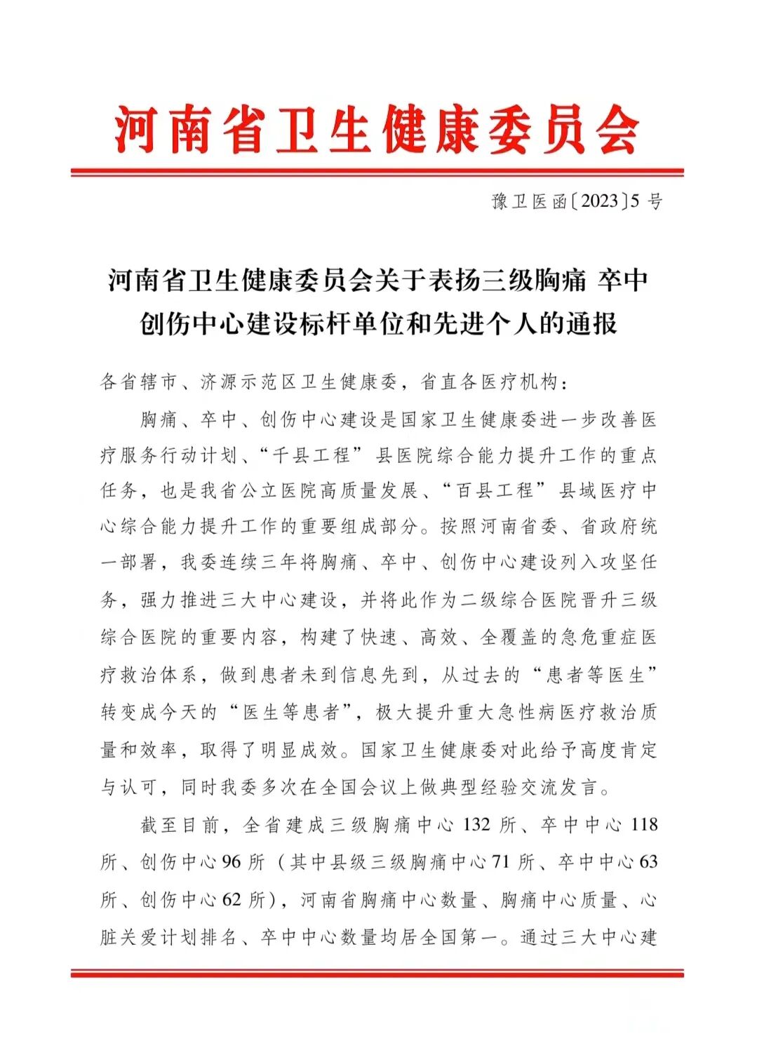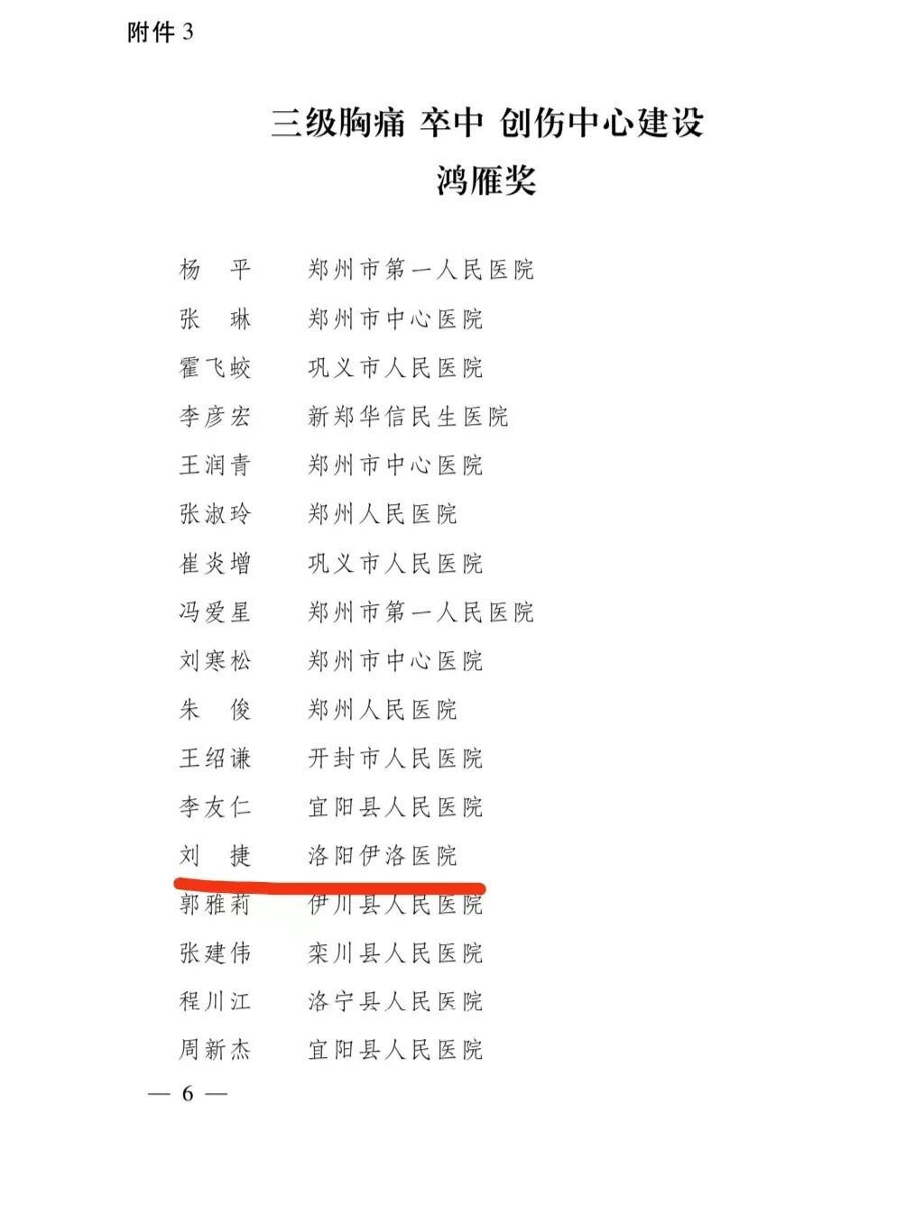 為弘揚(yáng)先進(jìn),展示全省胸痛、卒中、創(chuàng)傷中心建設(shè)工作成效,形成典型帶動(dòng)、示范引領(lǐng)的工作氛圍,推動(dòng)各級(jí)醫(yī)院綜合能力持續(xù)提升,河南省衛(wèi)健委在全省評(píng)選出了一批三級(jí)胸痛、卒中、創(chuàng)傷中心建設(shè)標(biāo)桿單位和先進(jìn)個(gè)人,洛陽伊洛醫(yī)院劉捷院長獲得鴻雁獎(jiǎng)先進(jìn)個(gè)人,全省113人獲此殊榮。