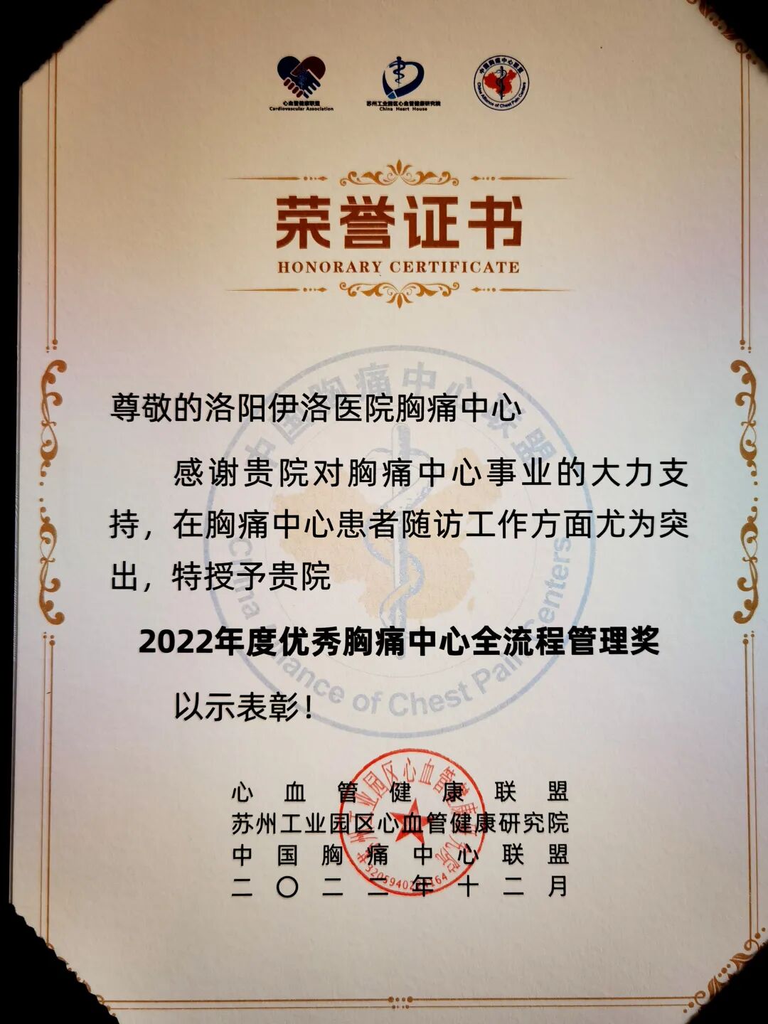 喜報(bào)!洛陽(yáng)伊洛醫(yī)院胸痛中心榮獲全國(guó)“2022年度優(yōu)秀胸痛中心全流程管理獎(jiǎng)”。